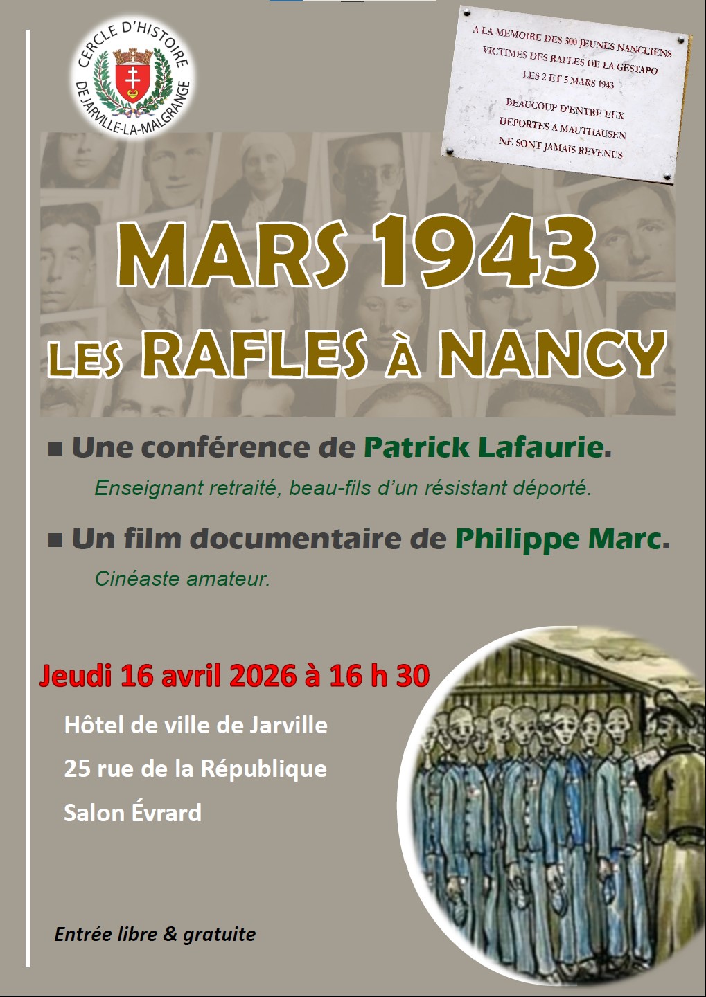 Les 2 et 5 mars 1943 à Nancy, de nombreux jeunes gens sont raflés pour être déportés en Allemagne. Ces importantes déportations ont particulièrement frappé le quartier Saint-Sébastien. La conférence porte sur la relation de ces douloureux événements et des suites dans les camps de concentration.