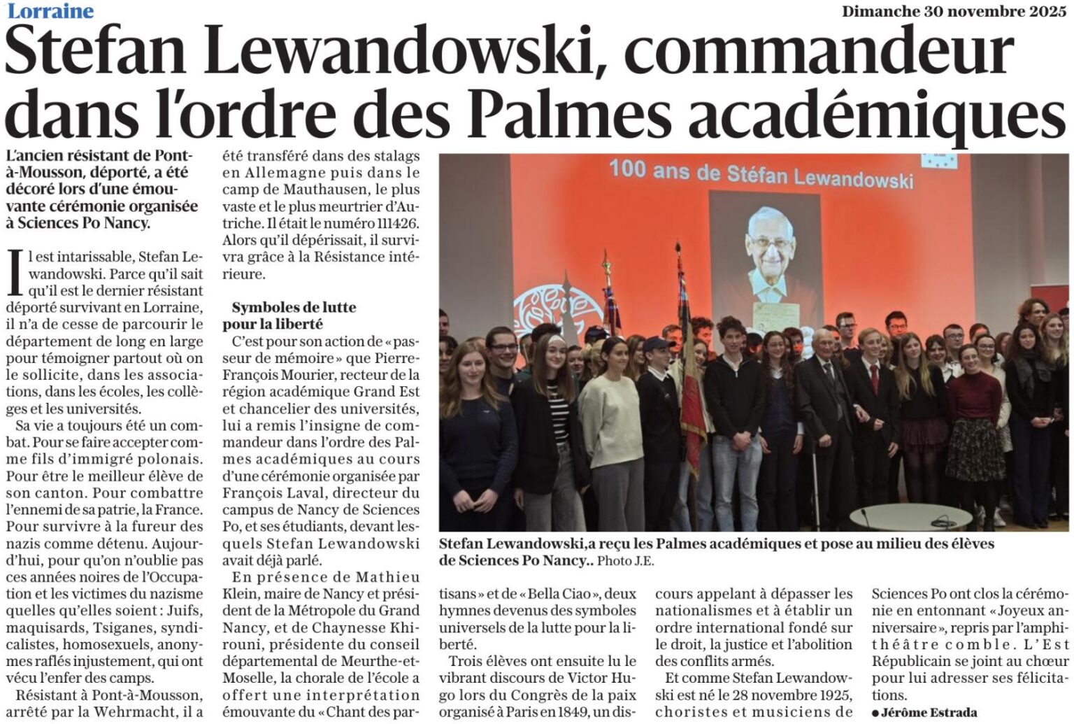 Lu dans l’Est Républicain :<br>Vendredi 28 novembre 2025<br>Les 100 ans du Jarvillois résistant, Stephan Lewandowski.<br>28/11/2025
