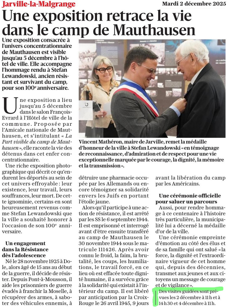Lu dans l’Est Républicain :<br>Vendredi 28 novembre 2025<br>Les 100 ans du Jarvillois résistant, Stephan Lewandowski.<br>28/11/2025